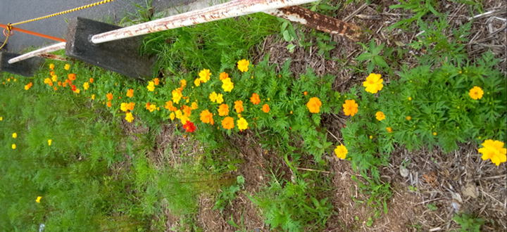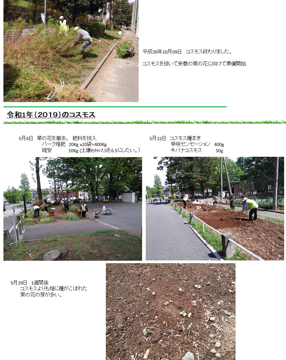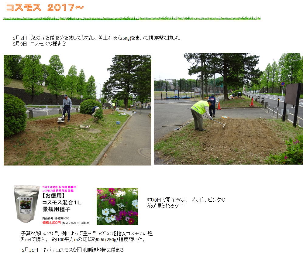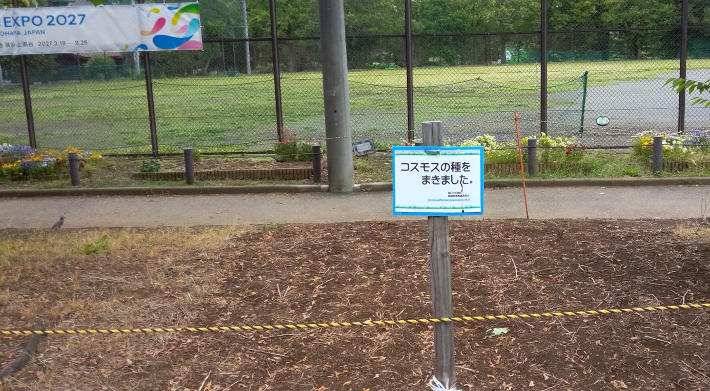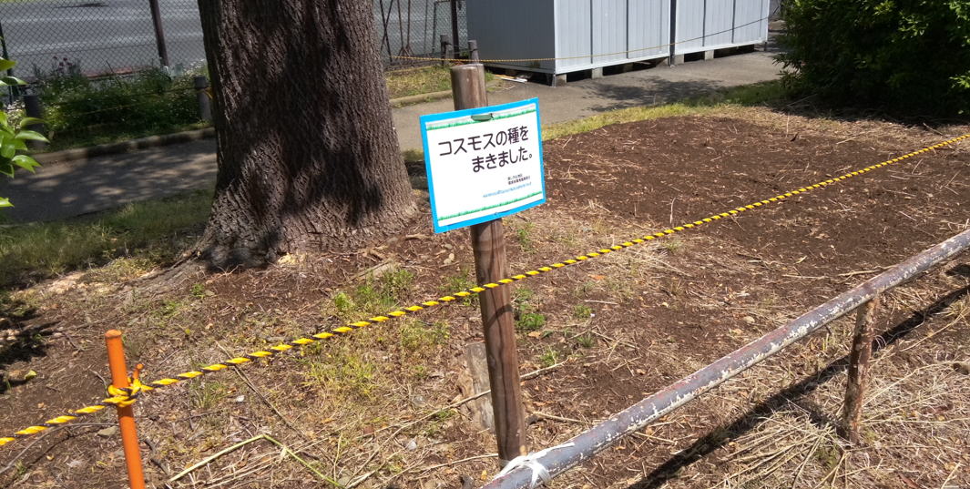 5/03 種まき 3種類と畑から採取したキバナ・コスモスをまきました