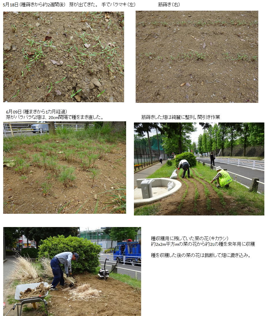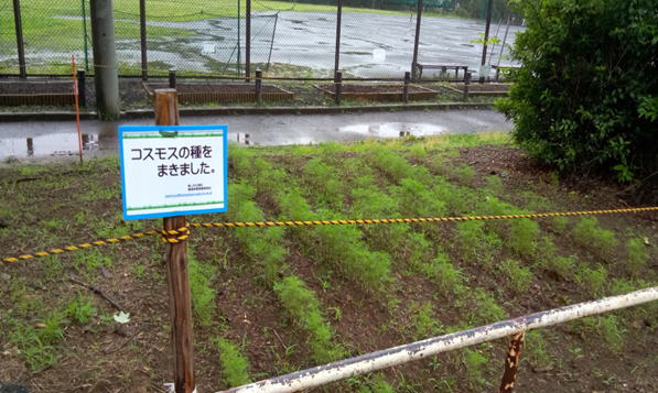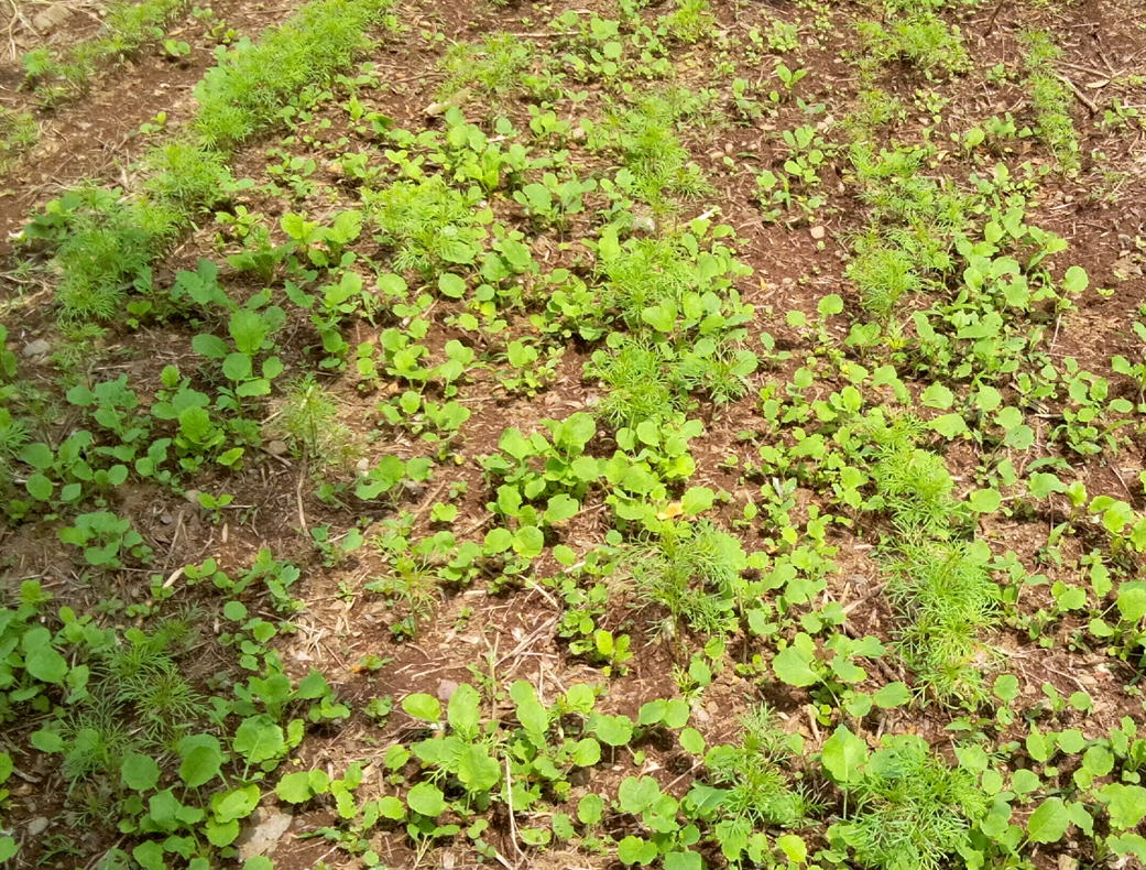 種まき3週間後。菜の花の種が復活し、菜の花畑に。
