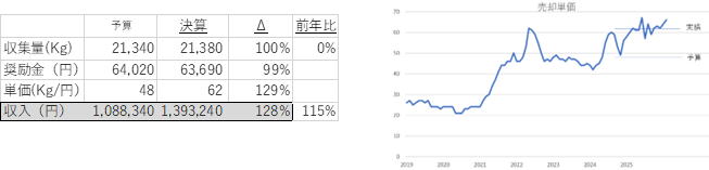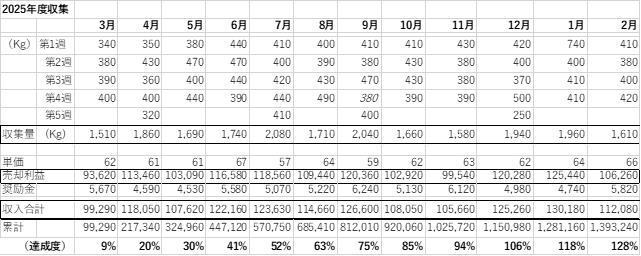 ・単価低迷にも関わらず収集量が前年比10%増となり収入は前年比104%を達成