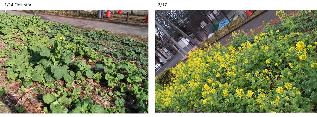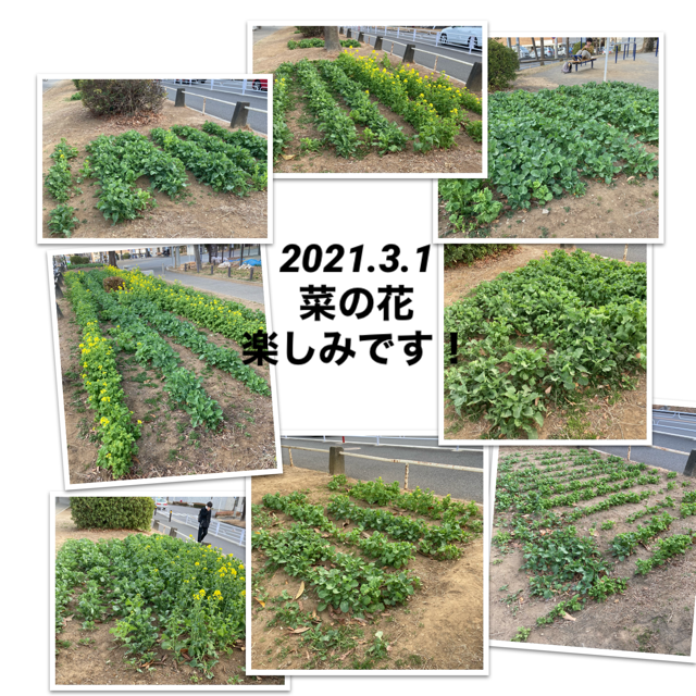 2022/3/17 早咲きは花が咲いたが、遅咲きは未だつぼみ。紫大根は小さな花をつけた。